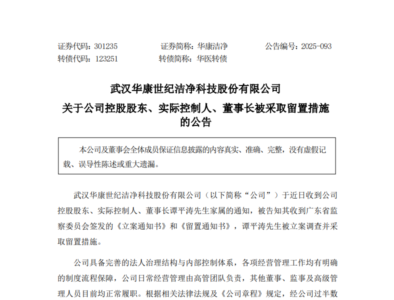 13日盘后,A股上市公司华康洁净(301235)(301235)对外披露,公司于近日收到控股股东、实际控制人、董事长谭平涛家属的通知,被告知其收到广东省监察委员会签发的《立案通知书》和《留置通知书》,谭平涛被立案调查并采取留置措施。